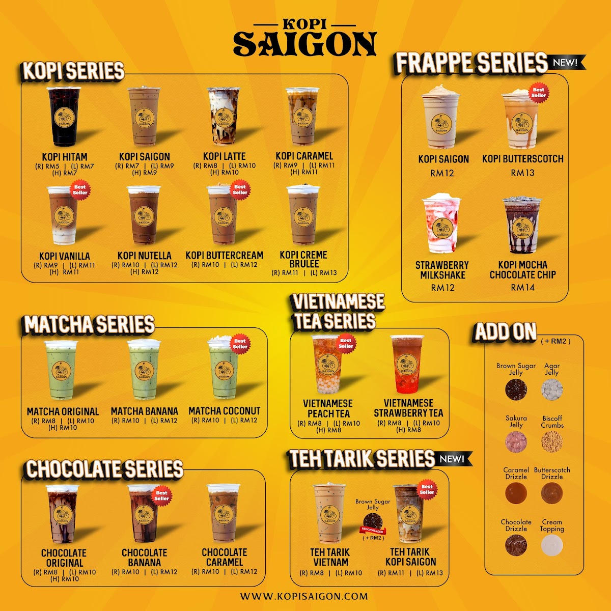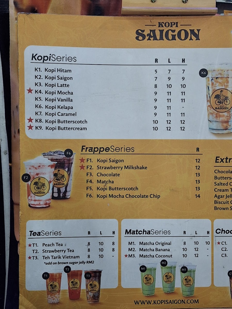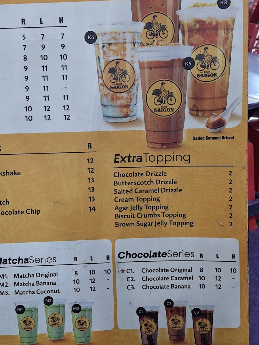 Welcome to Kopi Saigon @Semenyih, a delightful coffee shop nestled in the vibrant heart of Semenyih, Malaysia. With an enticing menu that beautifully blends authentic Vietnamese coffee and local flavors, this establishment promises a unique culinary experience. The spotlight shines on their newly launched Frappe Series, featuring indulgent options like the rich Kopi Mocha Choc Chip Frappe and the sweet Kopi Butterscotch Frappe, all reasonably priced. For tea enthusiasts, the Ice Vietnamese Tea selections, such as the refreshing Peach Tea, offer a delightful escape. Patrons rave about the friendly service and the inviting, clean environment, making it a perfect spot for a casual hangout. Customers have praised standout items like the signature Vietnamese coffee and Matcha Banana drinks, reflecting a commitment to quality and flavor that keeps them coming back. Discover a refreshing blend of culture and taste at Kopi Saigon!